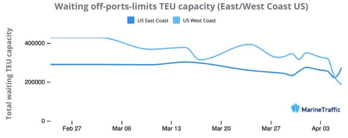 The MarineTraffic data reveals a major reversal: The East Coast now has more capacity waiting than the West Coast. As of Wednesday, ships waiting in the East Coast queue had 87,000 TEUs more capacity than those in the West Coast queue.