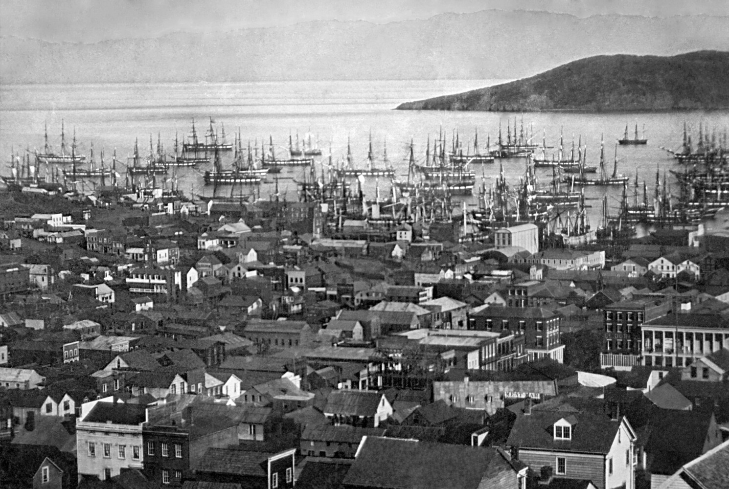 San Francisco harbor 1850s. During this time, the harbor was so crowded ships had to wait days before unloading passengers and cargo. From the Library of Congress