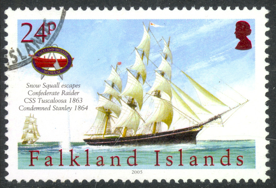 This Falkland Islands stamp commemorates Snow Squall’s escape from the Confederate raider Tuscaloosa. From the collection of Charles H. Lagerbom