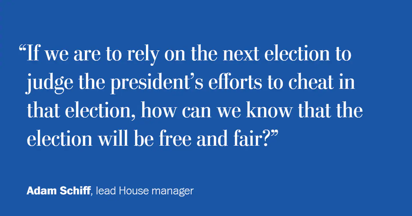 That’s lead House impeachment manager Rep. Adam B. Schiff (D-Calif.), talking about Trump in a scathing speech to close Democrats’ case Monday. His point was: If Trump invited the Russians to hack Hillary Clinton’s emails in 2016, if Trump invited China to also investigate Hunter Biden, and if Trump has not acknowledged wrongdoing or apologized for the things he was impeached for (like Bill Clinton did), what will he do next if he stays in office?