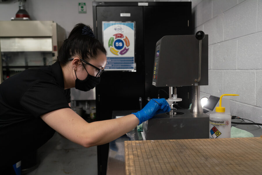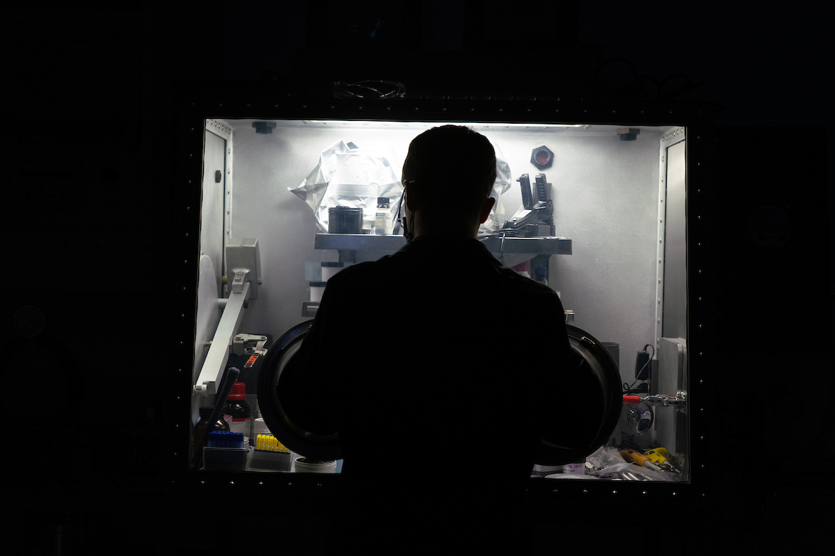 When dealing with UV technology, safety comes first. Here, an employee working in the Li-ion Battery Research and Development lab is assembling coin cell batteries in a glove box. The batteries will be used as test samples.
