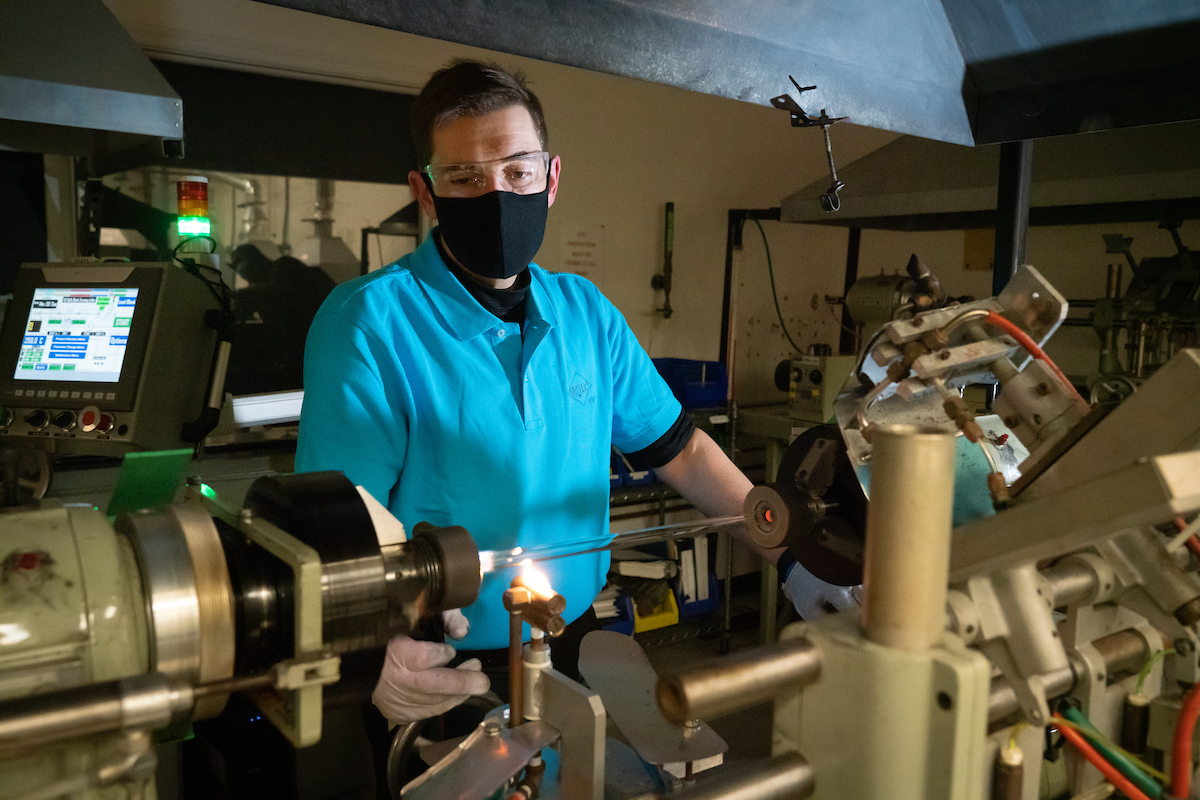 Here, an employee at the Bulb division is making a UV bulb. Miltec manufactures thousands of bulbs each year for export around the globe: