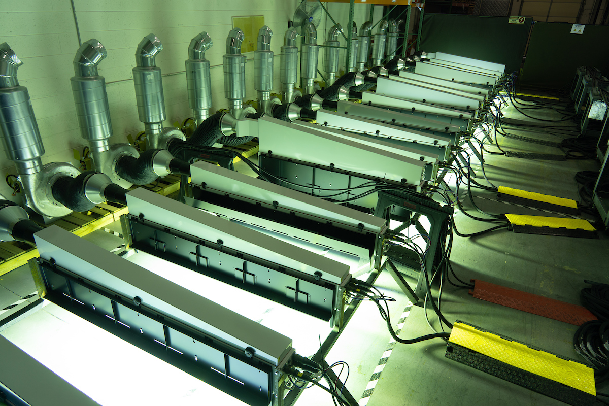 The set of a sci-fi movie? Nope. It’s just the testing of a 16-lamp UV curing system that produces more than 530 KW of UV power. Ultimately, the customer will use this system to cure inks and coatings on a high-speed printing press that manufactures outdoor packaging bags, such as for Miracle-Gro.