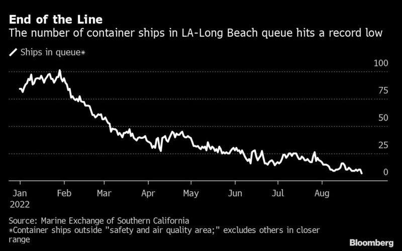 (Bloomberg) — The number of container ships headed for the California ports of Los Angeles and Long Beach — a traffic jam that once symbolized American consumer vigor during the pandemic — declined to the lowest level since the bottleneck started to build two years ago.
