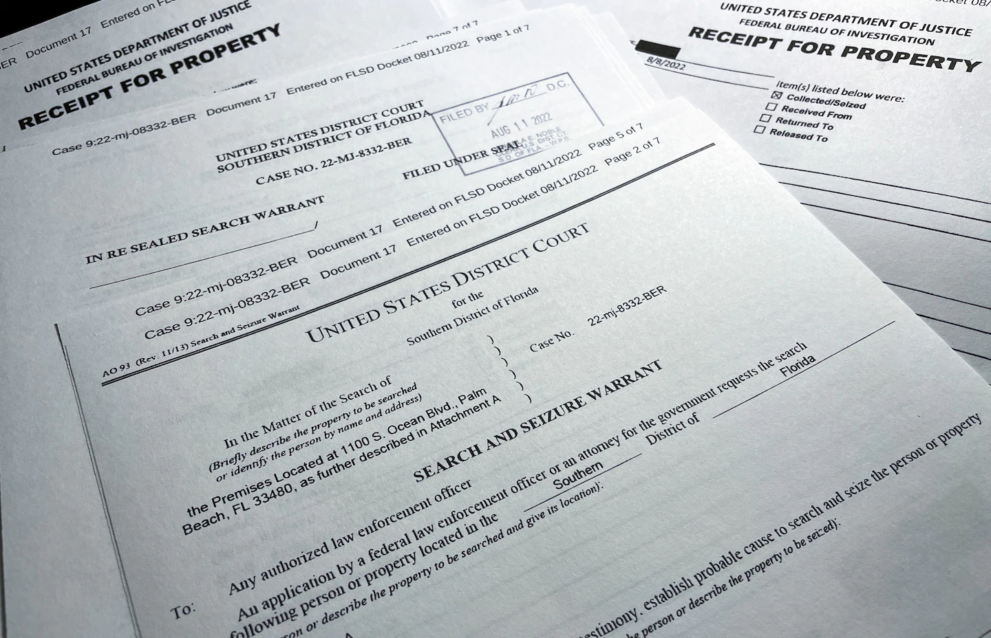 Aug. 8. Mar-a-Lago is searched by the FBI. Among the material recovered are more than 20 boxes of material, two binders of photos, and a number of classified items identified as confidential, secret or top secret.