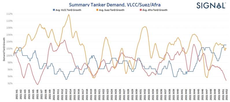 Chart 2: Signal Ocean Data| Crude Tankers, Ton Charts, Demand in Ton Days % Growth, Year 2021, per Quarter and Month