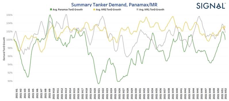 Chart 3: Signal Ocean Data| Product Tankers, Ton Charts, Demand in Ton Days % Growth, Year 2021, per Quarter and Month
