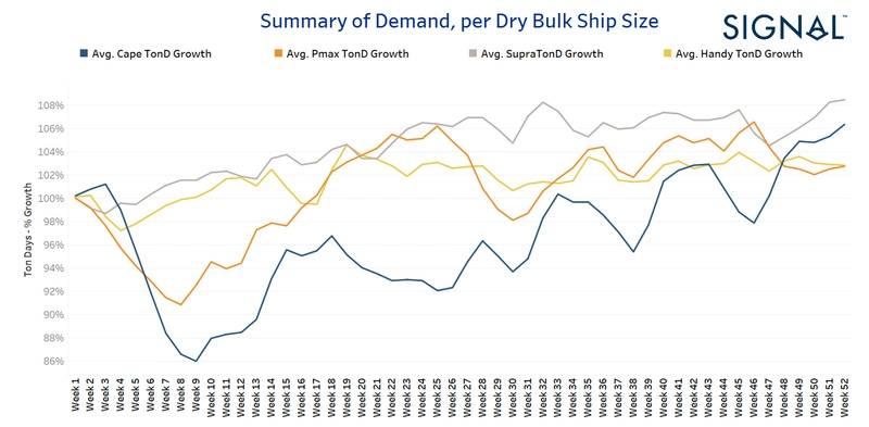 Chart 1: Signal Ocean Data| Dry, Ton Charts, Demand in Ton Days % Growth, Year 2021, per Quarter and Month