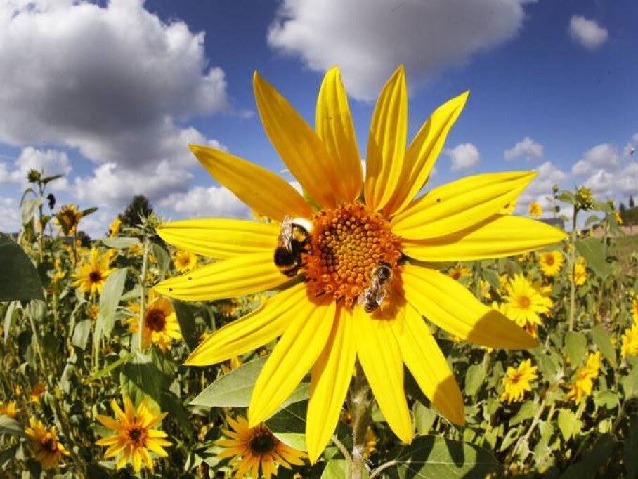 A bumblebee and a bee sit on a sunflower on a field near Frankfurt, Germany. (Michael Probst/AP)
