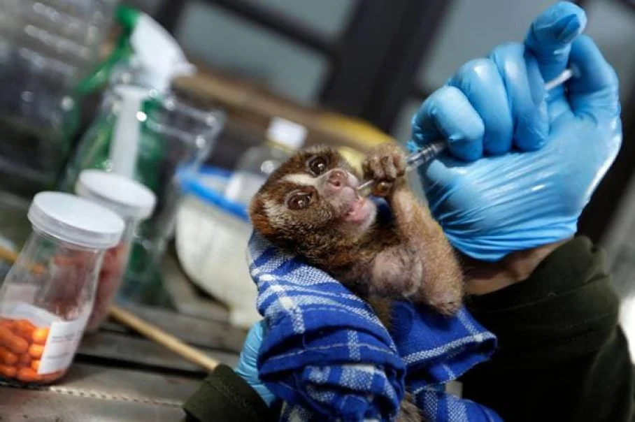 Slow loris (Nycticebus Coucang) gets a medical treatment from a vet at the Aceh Natural Resource Agency office in Banda Aceh, Indonesia. (Hotli Simanjuntak/EPA-EFE)