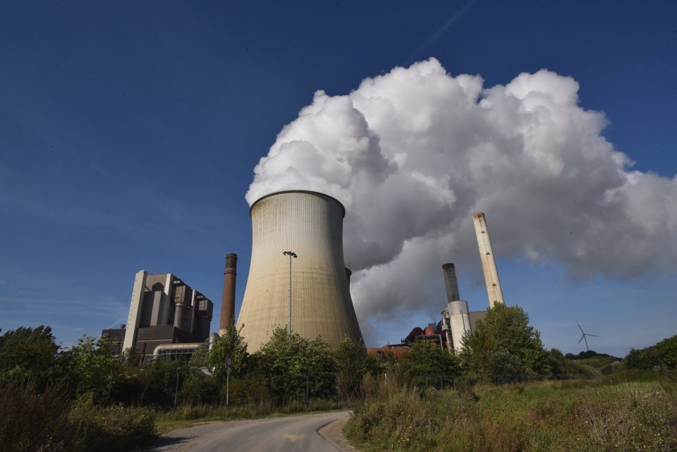 Thick smoke, cloud of water vapour comes out of the cooling towers of the lignite-fired power plant Weisweiler of RWE Power AG in Germany.