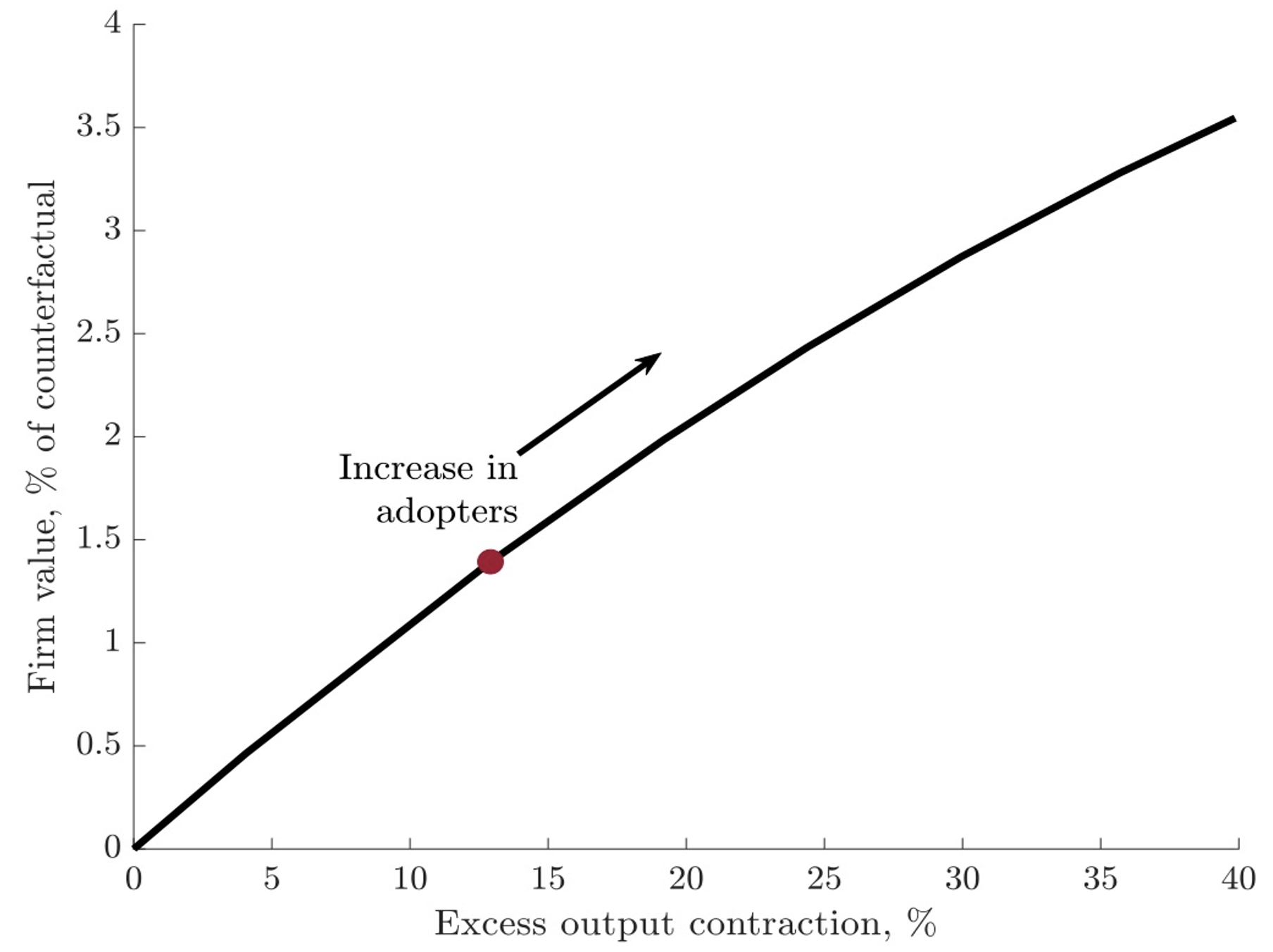 I proceed to quantify the trade-off for a range of counterfactual economies, each with a different level of JIT adoption. Figure 2 traces out this frontier. The vertical axis plots the firm value gains to JIT production in normal times while the horizontal axis plots the excess output contraction (in percentages) amid the unexpected supply disruption. As the arrow indicates, moving up and to the right along the frontier amounts to considering counterfactual economies with more JIT production. The red dot in Figure 2 denotes where I estimate the US economy to reside along this trade-off.