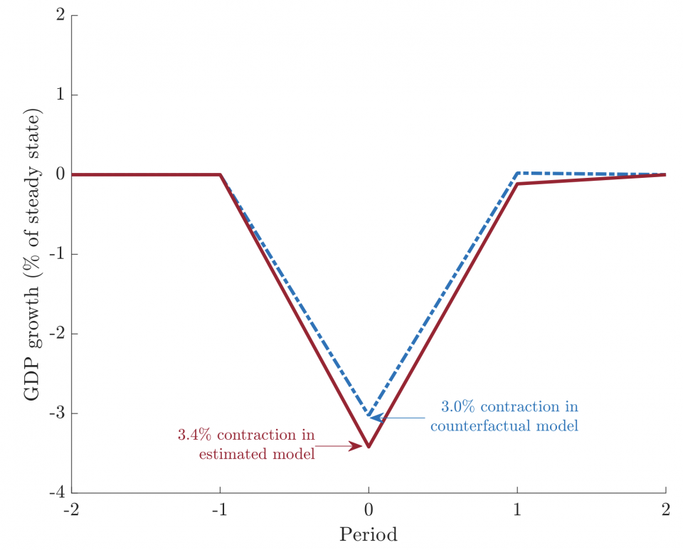 The other side of the trade-off relates to the vulnerabilities that JIT exposes. To examine this, I consider an unexpected supply shock that raises the marginal cost of orders. The supply disruption is calibrated such that it generates a 3.4% contraction in the JIT economy, in line with the decline in US economic activity in 2020. I then feed the same unexpected shock into the no-JIT counterfactual and find that the crisis is shallower, with an output contraction of 3%.1 The roughly 15% excess output contraction, which is attributed solely to JIT adoption, amounts to about a $100 billion gap and is comparable to the funds allocated for state and local governments with the passage of the CARES Act.2