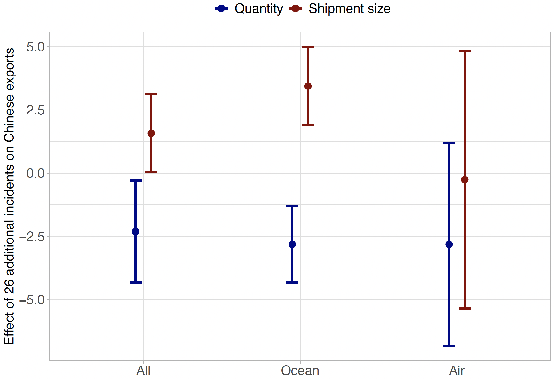 At the eight-digit product level, we show that piracy reduces Chinese exports to countries that are supplied by affected routes. Figure 3 illustrates the results using 95% confidence intervals. Effects on export quantity are shown in blue. The results indicate that one additional piracy incident along a set of routes linking China to a particular destination continent reduces exports to all counties on that continent by 0.1%. Given an average of 26 incidents per month along routes to Europe, this implies that exports are 2.3% lower than in a world without piracy. As illustrated in Figure 3, this aggregate effect is solely driven by adjustments in ocean trade, with estimated coefficients for air trade being not significantly different from zero.