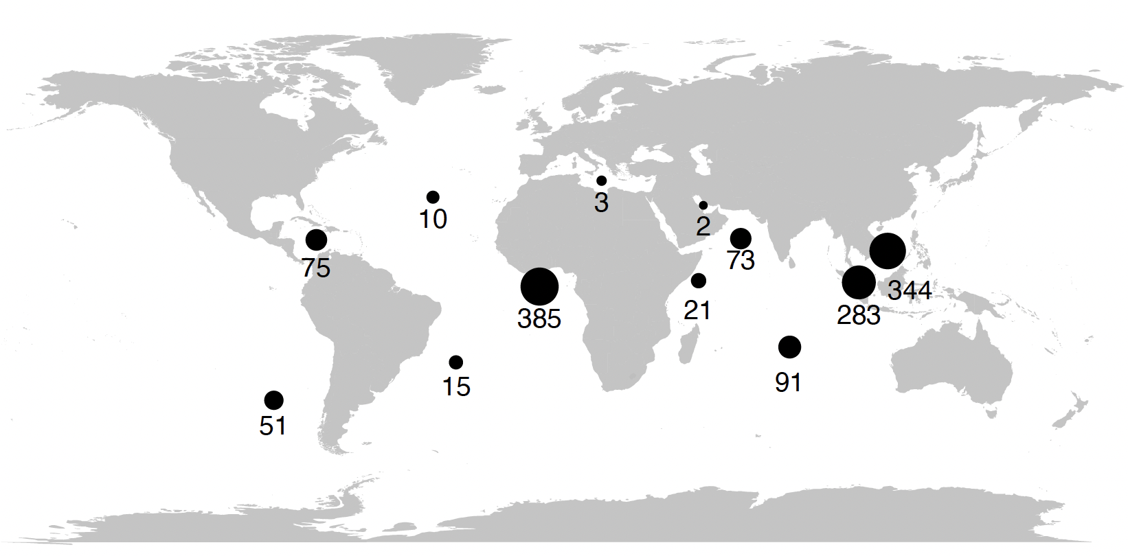Pirate attacks are not homogenously distributed across the oceans of the world and hit coastal areas of developing countries more frequently than those of developed countries. Figure 2 shows the distribution of pirate attacks in the time span from 2015 to 2020. Most attacks occurred in Western Africa totalling 385, followed by the South China Sea with 344, and the Malacca Strait with 283 attacks. Piracy has grown as a problem particularly fast in the Arabian Sea and along the coast of India in the past decade.