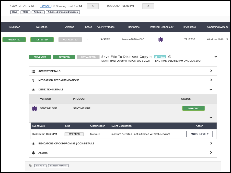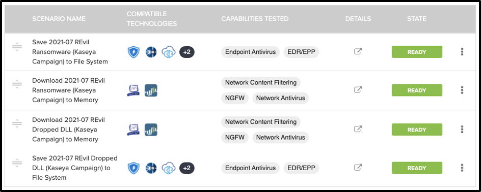The ransomware samples test includes saving REvil ransomware samples to both the file system as well as to disk. This is the first test in identifying whether or not your security controls are working as expected.