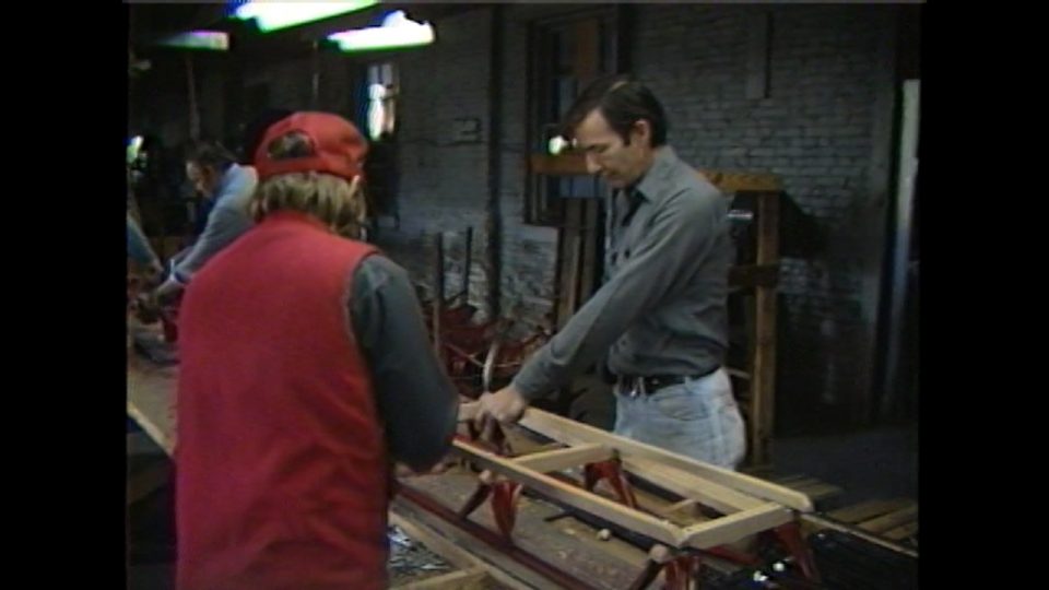 “How are they made, explain the process?” “Well, we start with rough lumber, and we cut the lumber to size, the width, the length, we sand it, we shape it, we cut the runners, we paint them, we rivet them, we assemble the whole sled. The final step in the process is dipping the entire sled into a protective varnish to cover the entire sled, and keeps the bad weather away from it.”