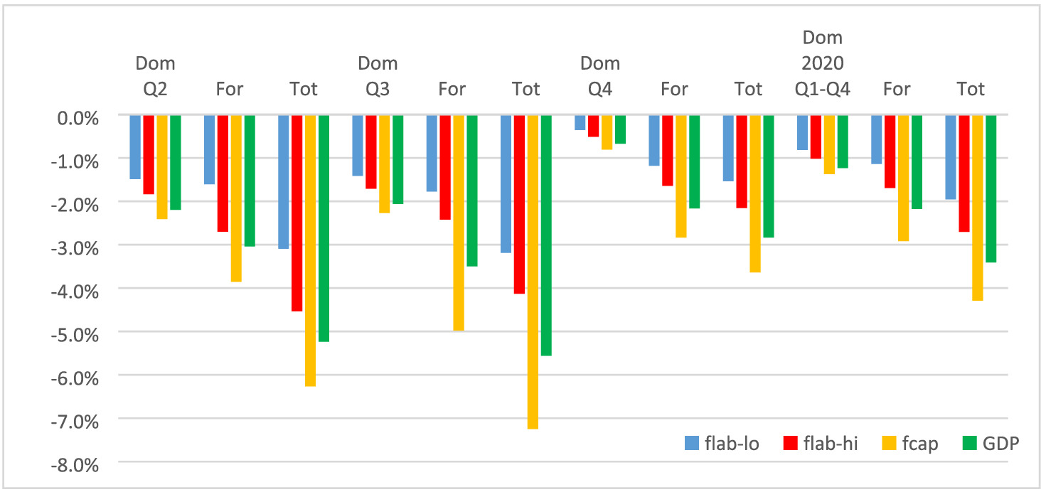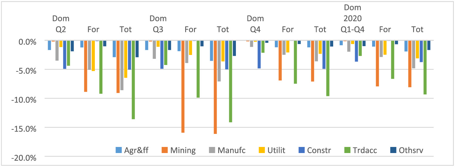 In other words, the data for 2020 cannot be used in any simple way to measure the impact of COVID-19 and the government mediation measures. Yet, they can help guide our modelling assumptions and can be used as a feedback on how well the model is calibrated. We based our assumptions regarding each quarter in 2020 on the best estimates available to us. Table 2 shows a summary of the assumptions made for each sector for each quarter of 2020.