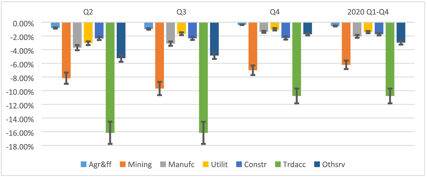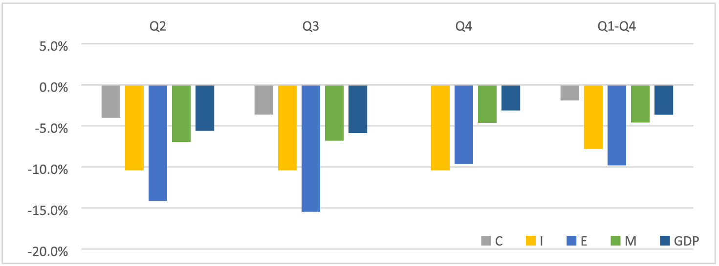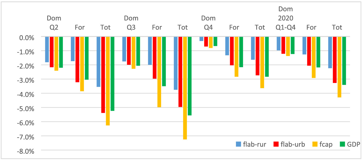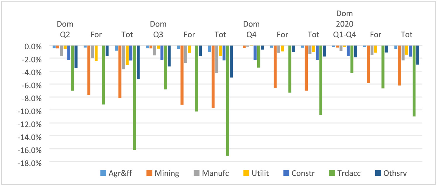 As a start date for the shocks, we chose the second quarter of 2020. The state of emergency took effect on 1 April, and some form of it (emergency or calamity) has been in place since. For our analysis, this makes it easy to identify the timing of the shock. We restrict our analysis to the calendar year 2020 and therefore only show the impact of the pandemic for the first three quarters. We do this because we aim to make the estimates comparable with official GDP data and GDP forecasts, which are usually reported/aggregated on an annual basis.