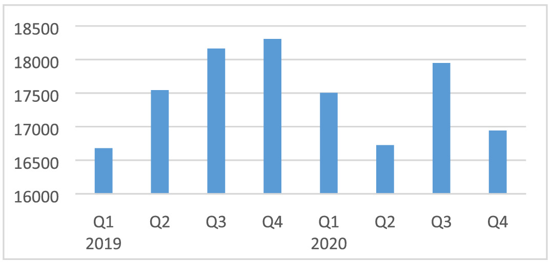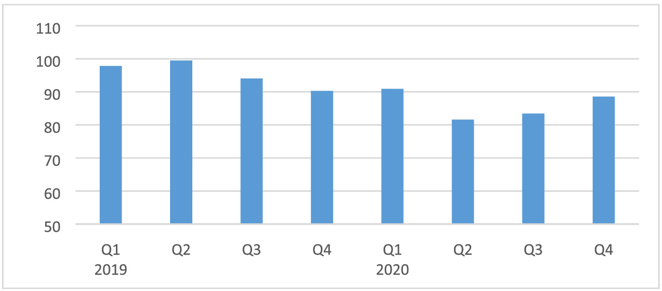 The Indice de Confiança e de Clima Económico (ICCE) reports the employment index shown in Figure 3. Employment was down by 10% and 8% in Q2 and Q3, respectively, compared with Q1. Based on the ICCE, we assume a mild impact (−1% to −10%) of COVID-19 on household consumption in Q2 and Q3. Considering the ongoing state of emergency and the slow opening of the economy towards the end of Q3, we assume an improvement to zero change in Q4 compared with Q1. This assumption is also in line with the ICCE index, which is only 2.5% lower in Q4 compared with Q1.