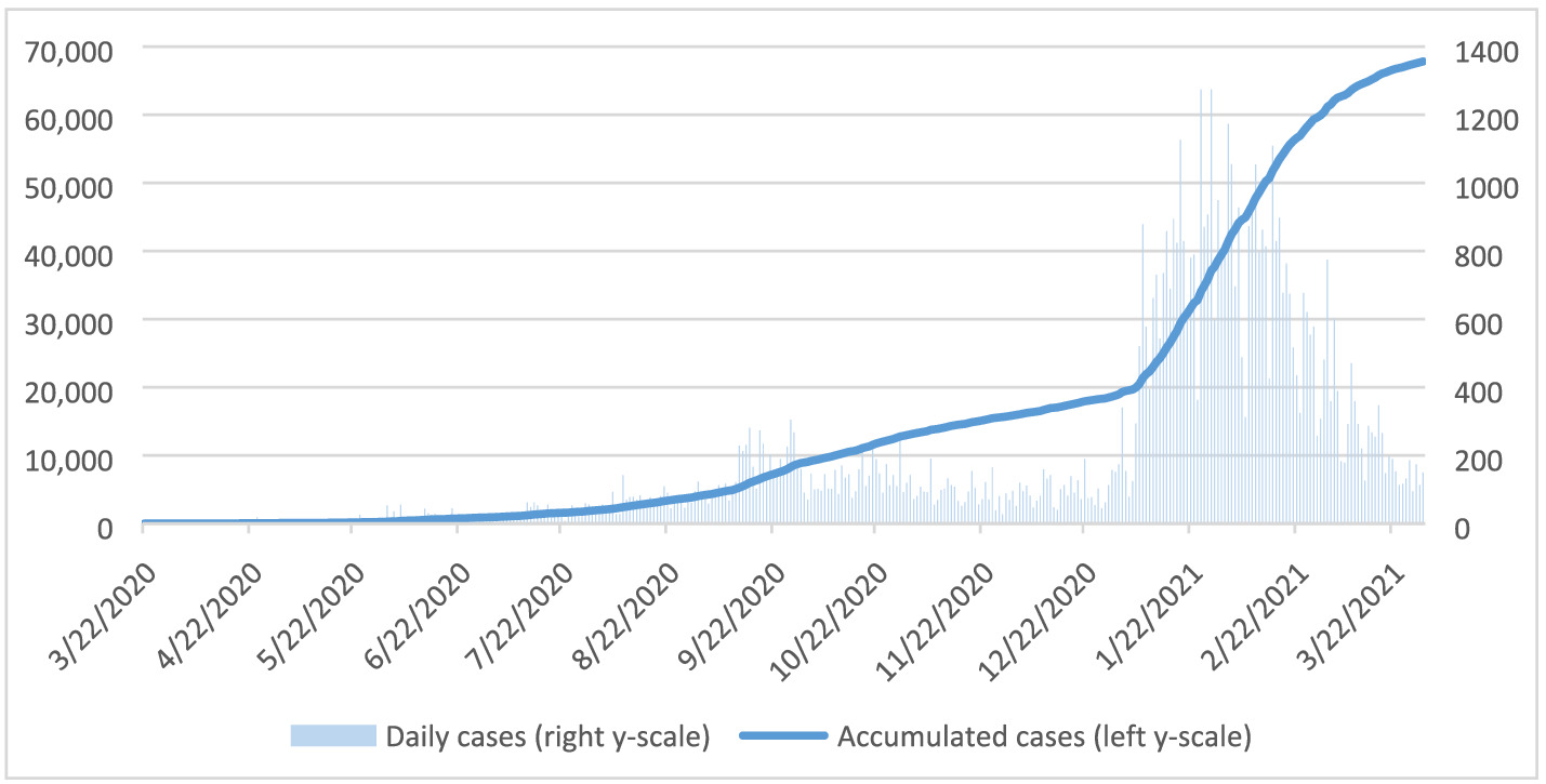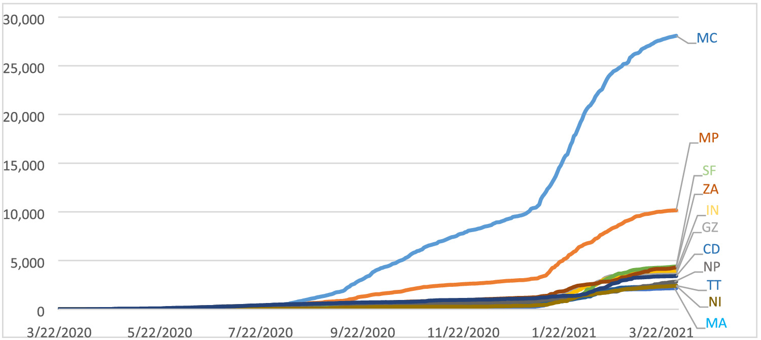 Compared with neighbouring countries, Mozambique was hit on a similar level except for South Africa. In all categories of cases and deaths, it was South Africa that suffered by far the most in southern Africa. Zambia, Zimbabwe and Malawi suffered from the pandemic on a similar level as Mozambique and in terms of deaths per 1 million Mozambique suffered the least (Table 1).