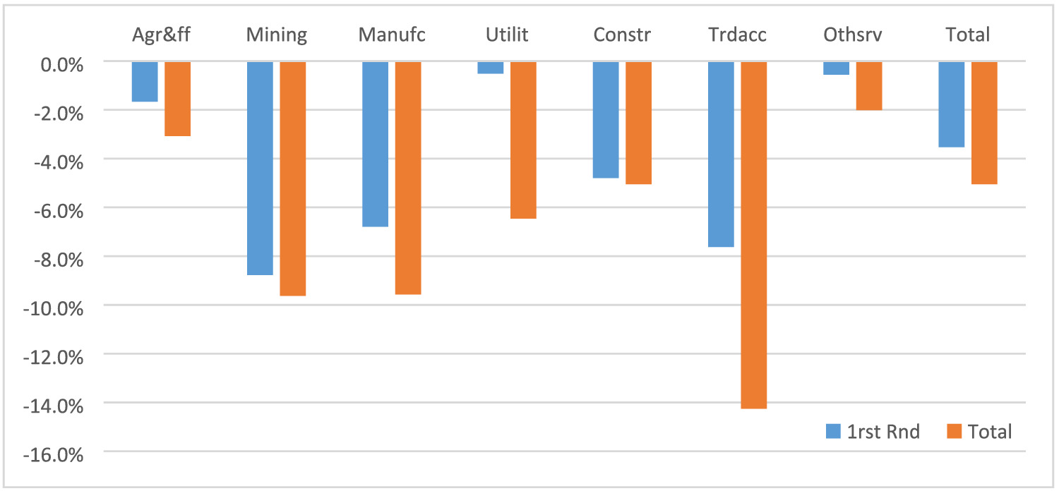 The previous section discussed how broad sectors of the Mozambican economy were affected directly by COVID-19 and the mitigation measures implemented by the government. However, knock-on effects of these direct impacts spread through the entire economy, upstream as well as downstream. In this study, we focus on the former. If one sector was impacted negatively, suppliers of intermediate inputs to that sector faced lower demand while the users of the output of the sector faced supply disruptions. The latter may not be relevant since final demand could be constrained.