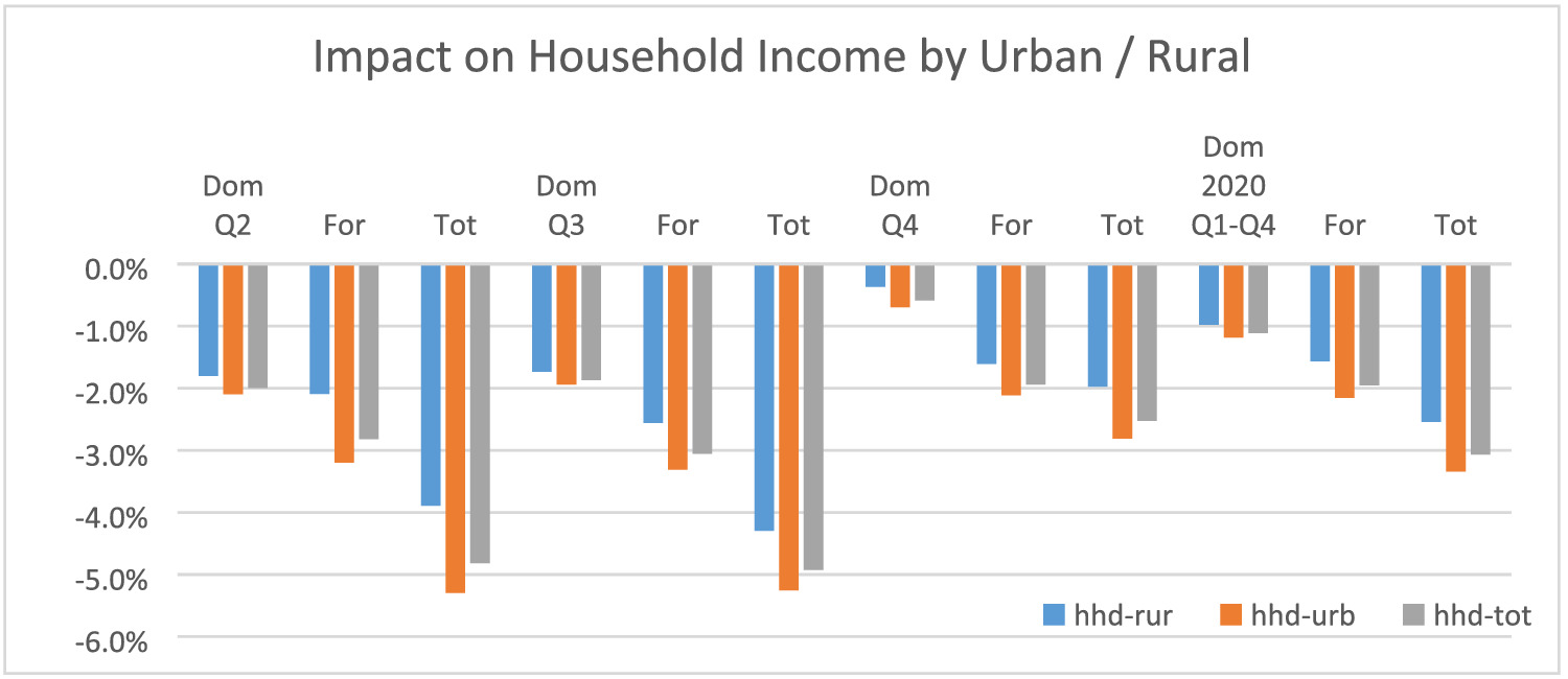 Household consumption in rural and urban areas has been affected by COVID-19 mainly through a reduction in disposable income. Lower production reduced the need for employment and therefore income. This effect is assumed stronger in urban areas where the density of people restricts movement proportionally more under social distancing rules than in spacious rural areas.