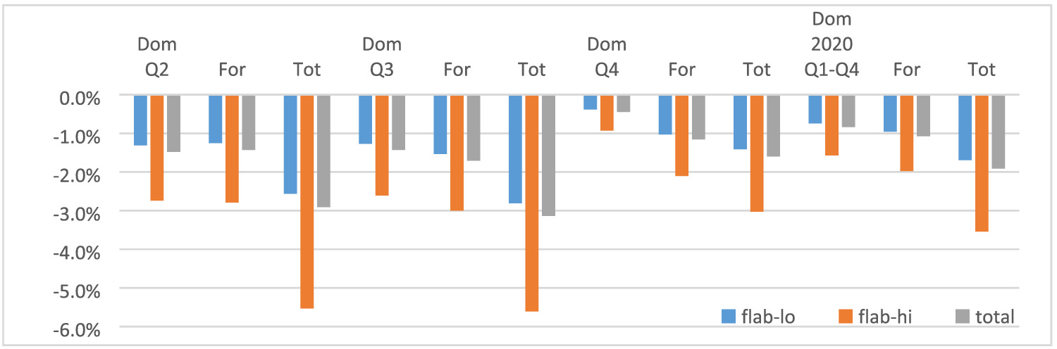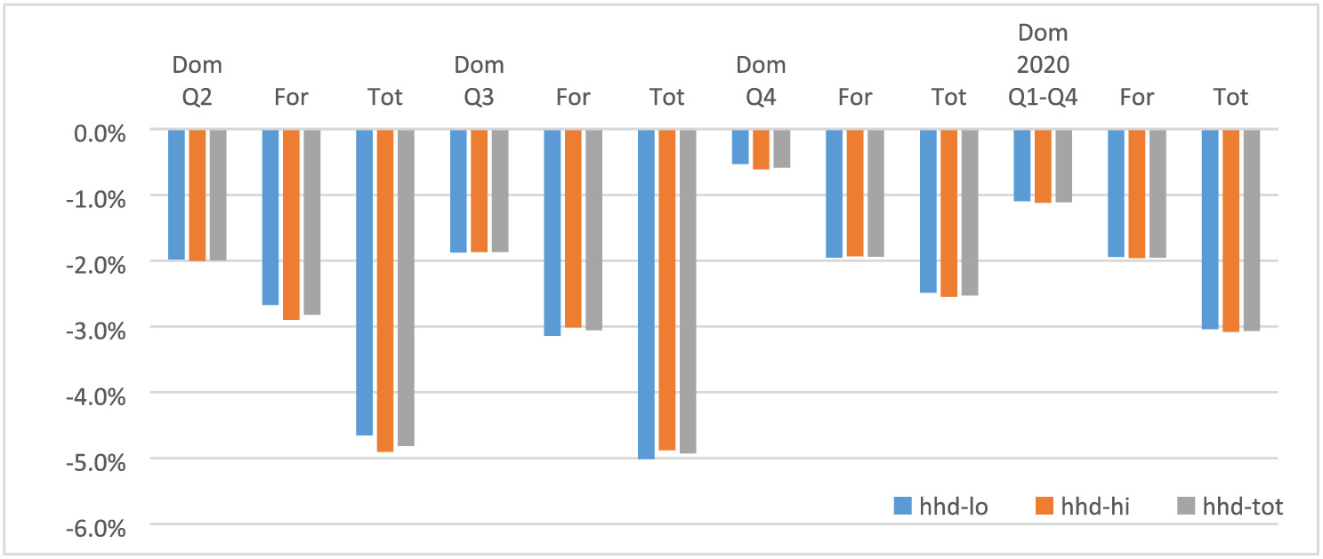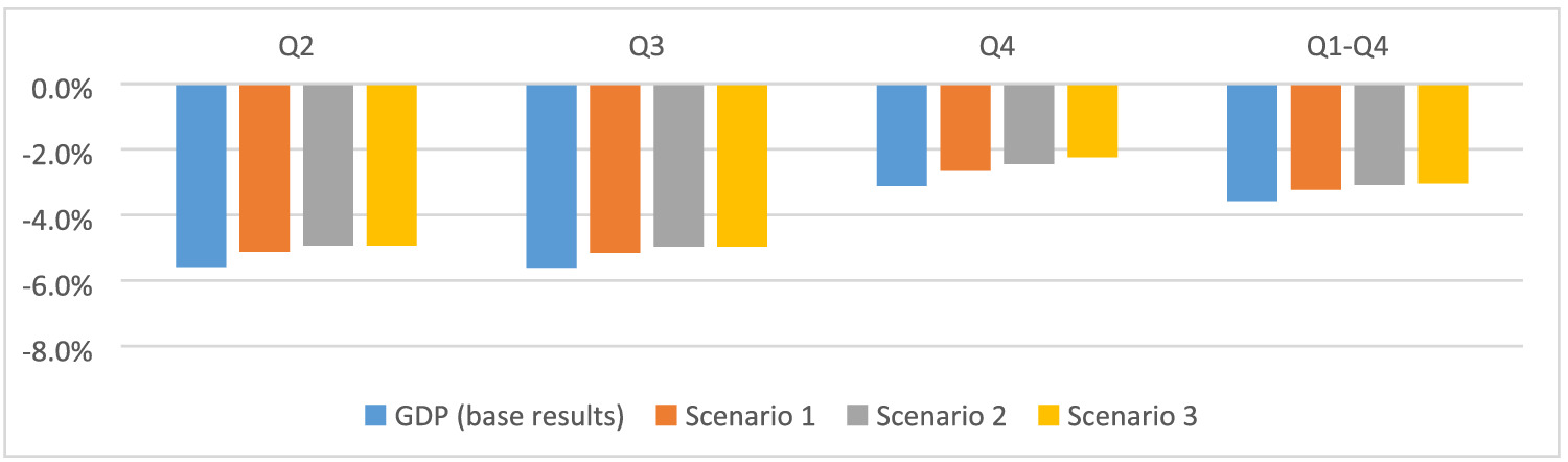 The assumption regarding the size of the effect through the demand channel was already discussed in Section 3.2, and we assumed that the demand changed accordingly throughout the whole economy, that is, for each sector. The assumed impact is mild (−1% to −10%) in Q2 and Q3 and 0% in Q4. Remember that only the biggest sectorial effect from the four channels (supply, demand, investment and export) enters the model as first round impact. The impacts through the remaining three channels were then calculated in the model. This means that for sectors where we assumed zero impact in Q2 and Q3 for the supply, investment and export channels the applied first round impact in the model work through the demand channel.