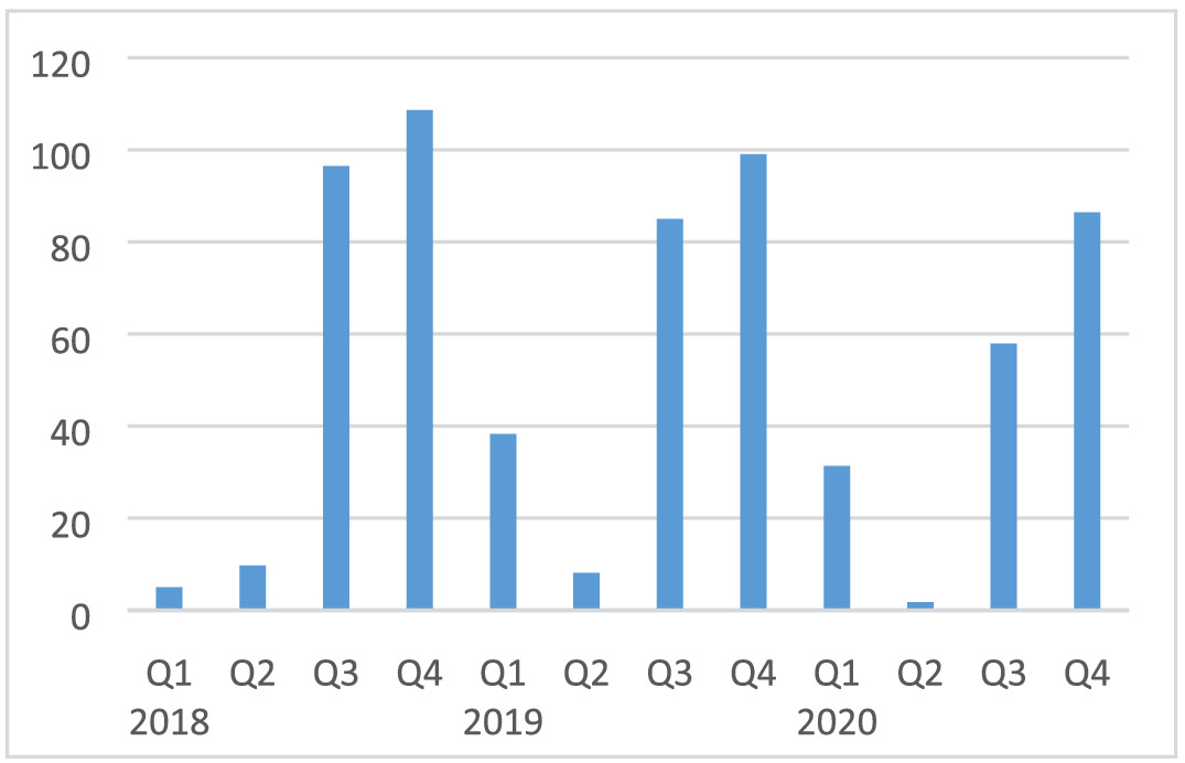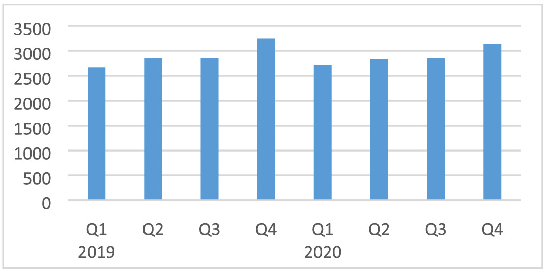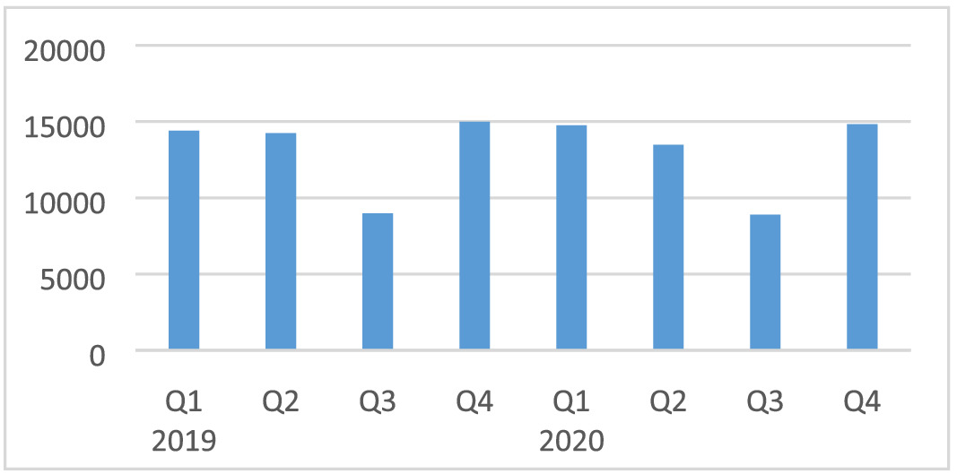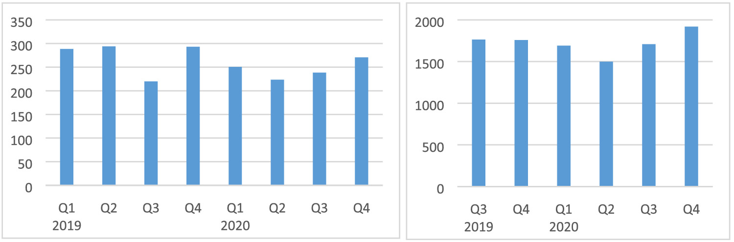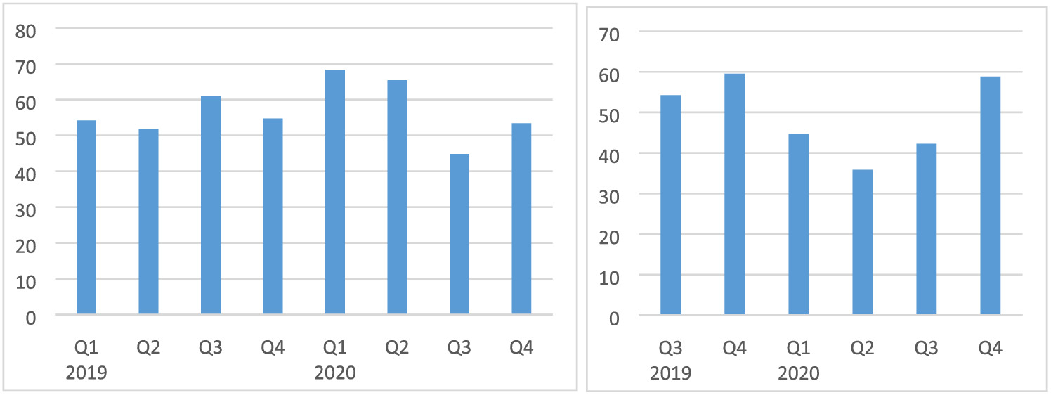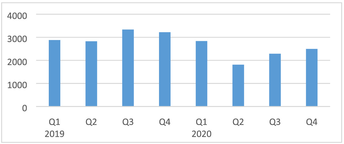 As guidance to determine the impact of COVID-19 and the mitigation measures on investments for machines and transport equipment, we used the value of imported capital goods (machines, tractors and semi-robotic machines) from BdM. Overall, the imported values decreased in Q2 by 34% compared with Q1 and by 30% compared with Q2-2019 (Figure A6). This would indicate a large impact of around 30%. It could be that some machines were not delivered because of supply chain problems abroad. However, we assume the impact on investment to be somewhat smaller at a moderate level (−10% to −20%) in Q2. This is because other political events such as the conflicts in the north and centre of the country also increased uncertainty with negative consequences for investment decisions. In Q3 and Q4 the value of imported capital goods decreased by 23% and 17% compared with Q1 and is around 33% and 26% less compared with Q3/Q4-2019 (Figure A6). Therefore, it seems that the negative impact continued for the rest of the year and therefore we assumed for Q3 and Q4 a moderate impact (−10% to −20%) as well.