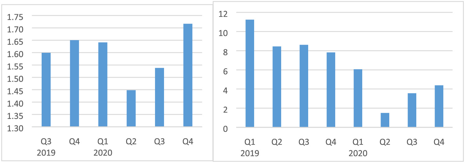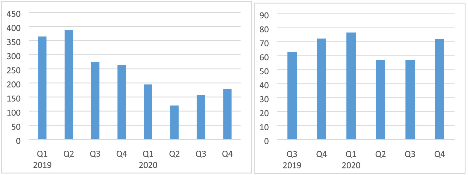 Natural gas produced in Mozambique is exported to South Africa via a pipeline. This technology does not require much labour and therefore can operate during the state of emergency without interruptions on the supply side. The situation is different on the South African side of the border. The pandemic affected South Africa severely up to the point that the government implemented a full lockdown. South African demand is what determines the export volume and as can be seen in Figure A10 (left) natural gas export decreased in Q2 by 5% compared with Q1. The situation worsened in Q3 when natural gas export decreased 34% compared with Q1. Considering that the price index for natural gas increased in Q3 indicates that the Q3 decrease in natural gas export was mainly due to lower volumes delivered to South Africa. In Q4, the natural gas price further increased which should have had a positive impact on Mozambique’s export earnings (Figure A10, right). However, in Q4, export values were still 3% lower than in the previous year and 22% lower than in Q1.