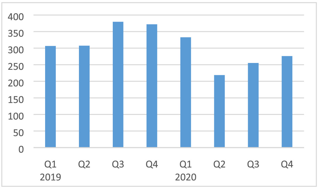 Coal exports in Q3 were also below pre-pandemic levels but already improved somewhat compared with the initial shock in Q2 even though the coal price continued to stay low. Therefore, we assume that the large initial shock in Q2 continued in Q3. For Q4, we assume an improvement of the situation based on the fact that the international coal price increased by 26% in the last quarter of the year and reached almost pre-pandemic levels. Even if the price reached pre-pandemic levels the export data show that complete recovery in terms of volume will take a bit longer, therefore, we assume for Q4 an improvement but still no complete recovery to pre-pandemic levels, that is, a moderate impact (−10% to −20%).