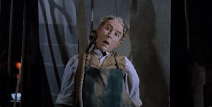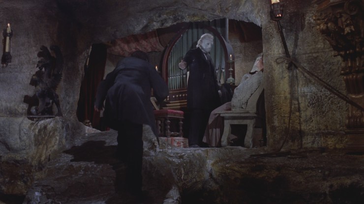 After fighting off the Phantom’s murderous Dwarf, played by Ian Wilson, a character largely incongruous with the plot other than existing to be the vessel of what violence does occur in the picture’s runtime, Harry reaches the Phantom’s sanctuary. Professor Petrie’s story is recounted here with emotionally pained aplomb by the Phantom. He tells of a timid, unmasked man, also portrayed by Herbert Lom, appearing alongside Michael Gough’s devilish Lord Ambrose D’Arcy in twisted frames that feel like they jumped right off the pages of an EC Comic book.