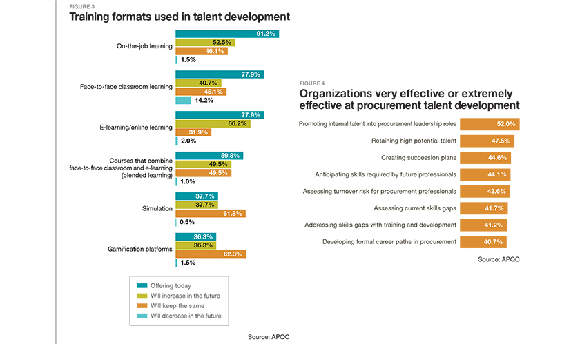APQC recommends that organizations identify the skills and training that are most beneficial to the business and its future and then make an honest comparison against the skills and training that benefit their current procurement professionals. By allowing focus on employee needs, organizations can create an environment that both attracts and retains top talent. At the same time, organizations must be aware that more talent development opportunities can lead to less time spent on the job. They must therefore plan accordingly to ensure that employees are not forced to choose between developing skills needed for the future and achieving today’s productivity goals.