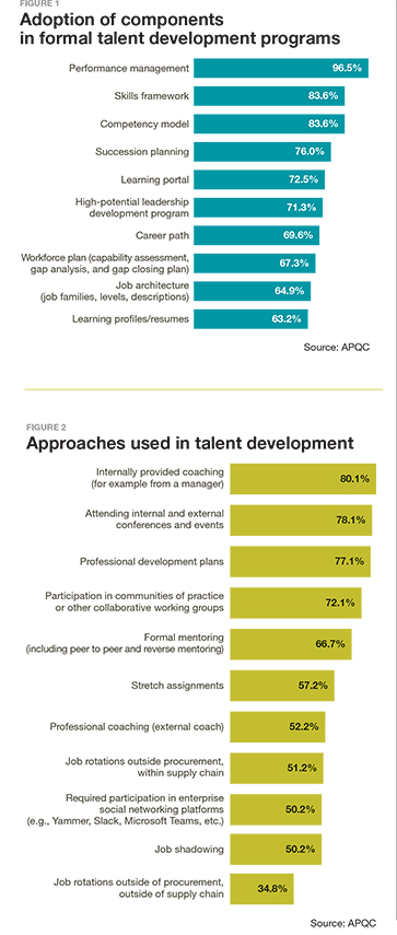 APQC also found that most organizations have talent management programs for procurement professionals. Nearly 60% of those surveyed have talent management programs in procurement. Of those that do not have one in procurement, 7% have a program at the level of supply chain management, and about 18% have a program at the enterprise level.