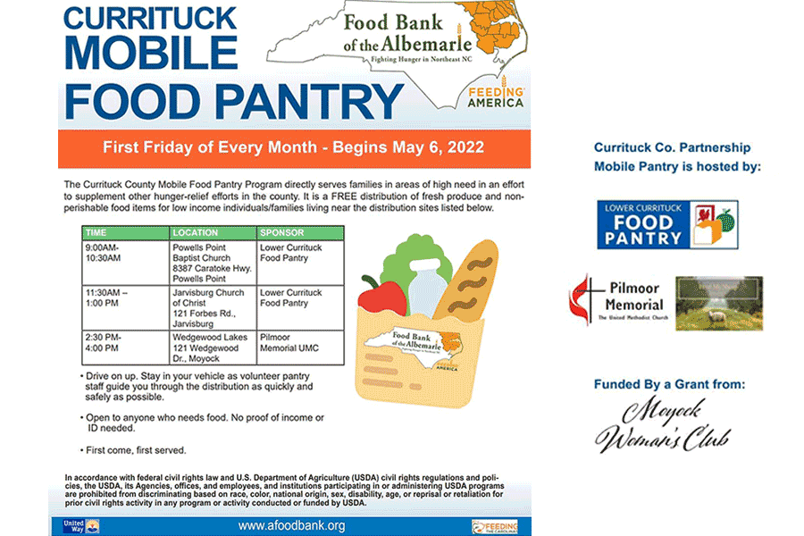 Beginning on May 6, the Currituck Mobile Food Pantry will provide FREE food distribution at three sites on the first Friday of every month!