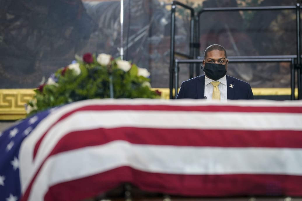 Capitol Police Officer Eugene Goodman pays his respects to late colleague William Evans, who was killed in the line of duty during the attack outside the U.S. Capitol.