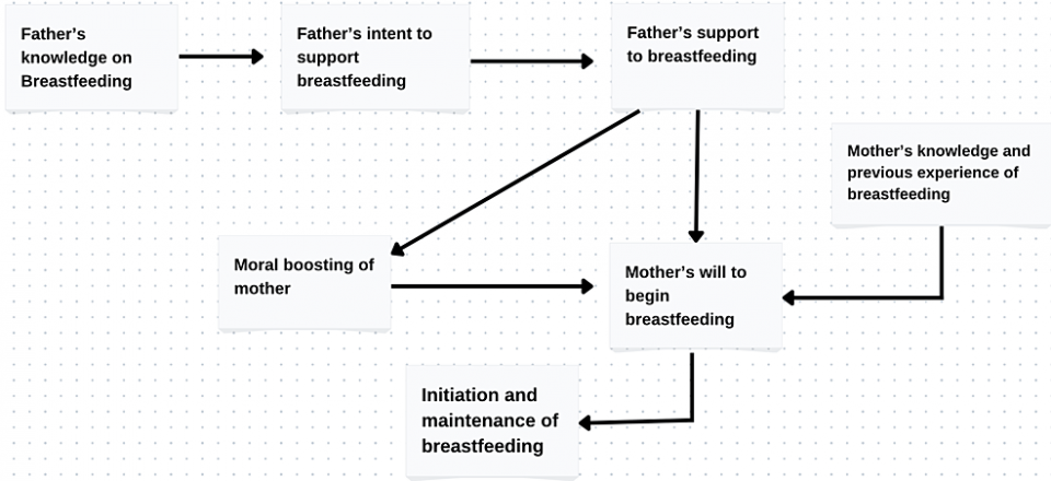 The father’s knowledge of breastfeeding causes him to want to support it, and his encouragement of breastfeeding enhances the mother’s confidence to start it. A mother’s earlier experiences and knowledge also encourage her to start and continue breastfeeding her children (Figure 1).