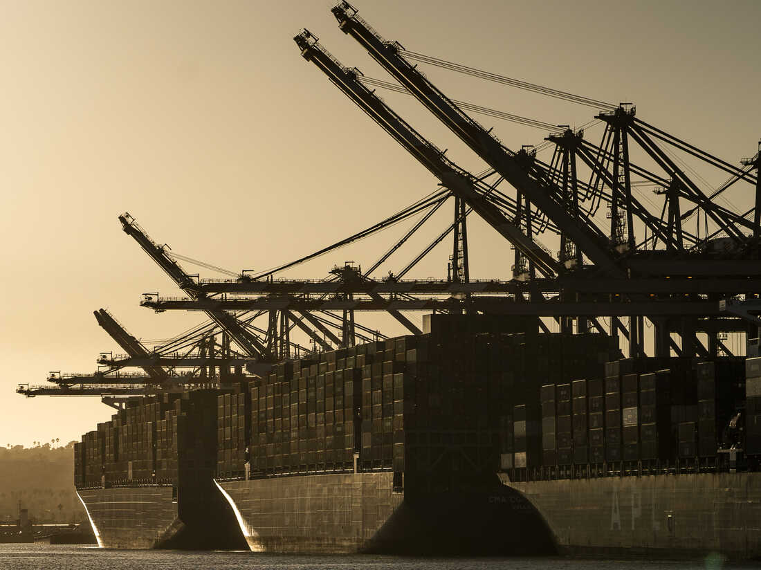 Bottlenecks have formed during the coronavirus pandemic at U.S. ports, causing shipping delays. Here, the CMA CGM Theodore Roosevelt (far left) and CMA CGM Panama (middle) container ships are moored at the Port of Los Angeles.