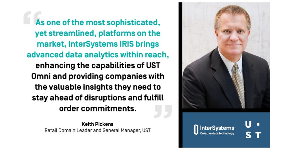“The ability to address supply chain disruptions before they occur based on prescriptive insights is an extremely valuable tool for businesses,” said Keith Pickens, Retail Domain Leader and General Manager, UST. “As one of the most sophisticated, yet streamlined, platforms on the market, InterSystems IRIS brings advanced data analytics within reach, enhancing the capabilities of UST Omni and providing companies with the valuable insights they need to stay ahead of disruptions and fulfill order commitments.”