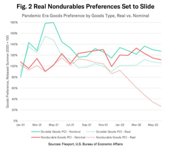 The inflation-adjusted dotted lines tell a different story. In real terms, Americans’ preferences for non-durable goods relative to services has plummeted since November, reflecting how prices for food and clothes (which are linked to global commodity prices), have so far risen quicker than prices for services.