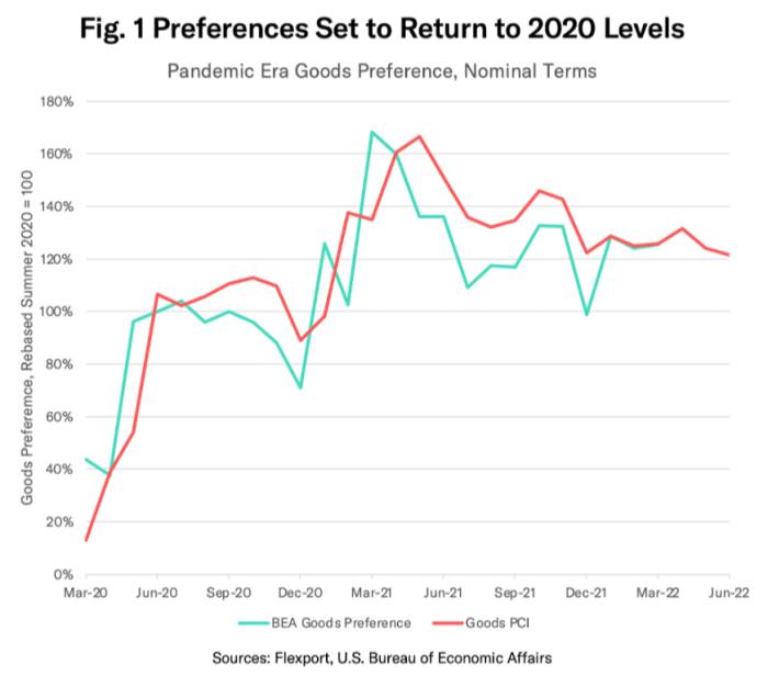Going off past correlations, Flexport estimates that consumers’ preferences for goods versus services today, in May — in aggregate and in dollar terms — remains pretty elevated, belying expectations that a “post-Covid” reopening of the economy would see spending patterns snap back to normal.