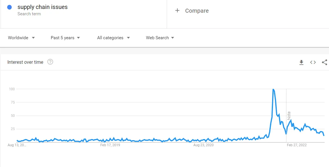 A common theme through this inflationary period has been supply chain issues. Interestingly, it was only in October 2021, according to Google, that supply chain issues entered the public debate. This coincided with the challenges unloading container ships on the West Coast of the United States.