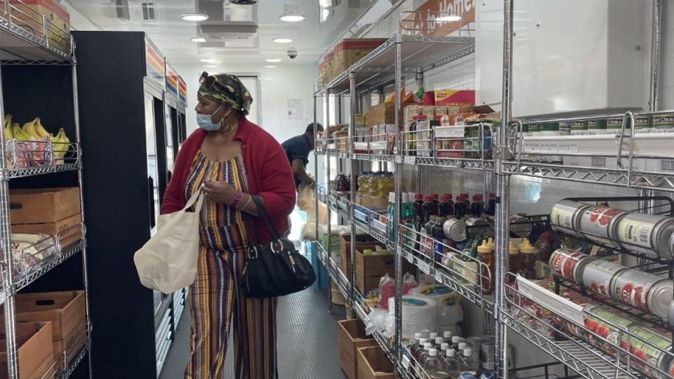 The roughly 20-foot trailer is stocked wall-to-wall with every type of grocery item one might need: bread, cereal, fruits, vegetables, canned foods, plates, and cups. It also opens from the back to comply with the Americans with Disabilities Act.