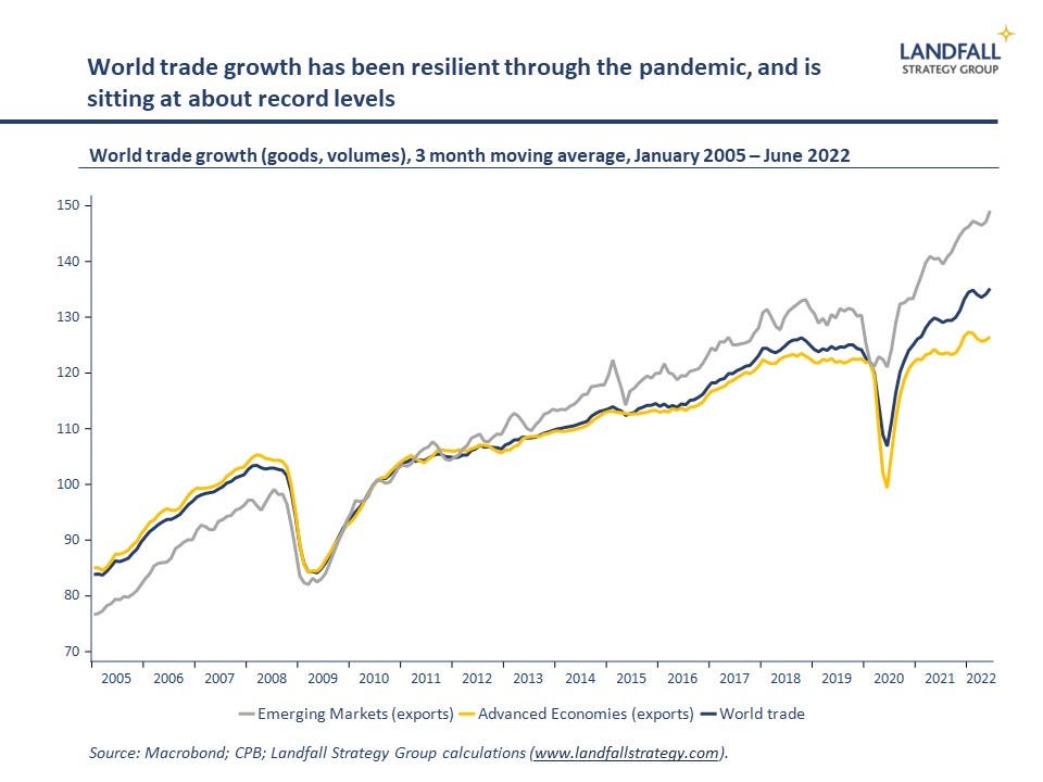 First, as I have noted before, globalisation is resilient. Although economic and political factors are generating meaningful changes to prevailing models of globalisation, in ways that make the global system more difficult to navigate, globalisation will continue (albeit in a more fragmented, political, regional manner). Countries and firms can continue to prosper through externally oriented growth models. Indeed, global trade flows have been resilient through the pandemic despite initial concerns.