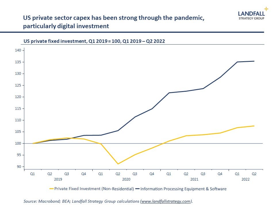 And across advanced economies, as well as China, industrial policy around key areas of technology is picking up markedly – notably semiconductors, but extending into a broad range of other areas. Public sector R&D is being increased in the US and elsewhere (note the recently-passed CHIPS and Science Act). The OECD report resilient and strengthening private sector R&D spending growth. And the pace of innovation in areas from quantum computing to AI is accelerating.