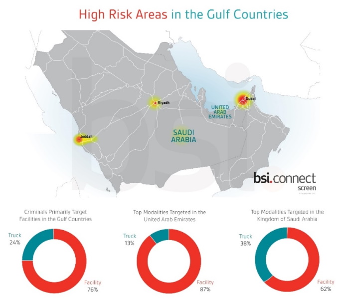 The report highlights that warehouse thefts and supply chain corruption are the stand-outs, with a concentration on higher risk areas across the United Arab Emirates (UAE) and in the Kingdom of Saudi Arabia (KSA). The role special economic zones play in the Middle East also effects regional disparities in cargo theft.