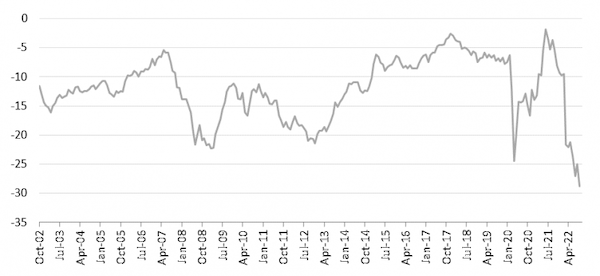 The ECB’s assessment that households will reduce their savings to maintain their level of consumption looks illusory to us, as European consumers tend to save more in times of great uncertainty. The Eurocoin indicator, a gauge of the underlying growth pace, perfectly illustrates the strong deterioration of the economic environment in September: it fell from 0.23% to -0.73%. We therefore stand with our forecast of a small negative growth figure for the third quarter of 2022 and a deeper downturn over the winter months. With the ECB in a tightening mode, we also anticipate a more subdued recovery over the course of 2023. For next year, we now anticipate a 0.8% GDP contraction, after a 2.9% expansion in 2022.