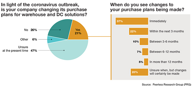 In light of the coronavirus outbreak, 21% of companies surveyed intended to change their plans for purchasing warehouse/DC solutions, while 47% were unsure of their path forward at the time that the survey was administered. Of those companies that were shifting their strategies, 37% were taking immediate steps while 22% expected those changes to come within the next three months. While some organizations still plan to follow through on their upcoming purchases, it’s clear that Covid-19 has created an environment of uncertainty.
