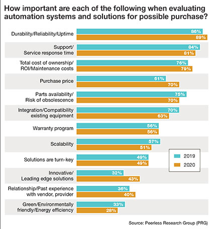 When evaluating automation systems and solutions, companies have some clear agendas in mind. Most (89%) want good durability and uptime, followed by support/service response time (81%). Others carefully assess total cost of ownership, return on investment (ROI) and maintenance costs (for 79%), with additional considerations including purchase price, parts availability, risk of obsolescence and integration/compatibility with existing equipment.