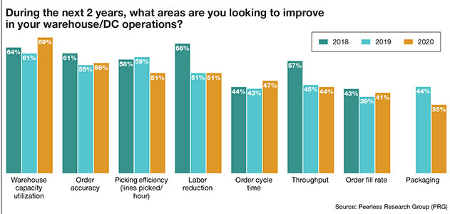 In considering which areas of the warehouse or DC they’d like to improve within the next two years, most respondents (69%) say warehouse capacity utilization, up from 61% who gave that answer last year. In addition, 51% of respondents want to improve picking efficiency and 56% are looking to update their order accuracy operations. Interest in labor reduction has decreased from 66% in 2018 to only 51% in 2020 (the same level as 2019).